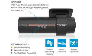 Parking mode with motion and impact detection, plus buffered recording before and after events.